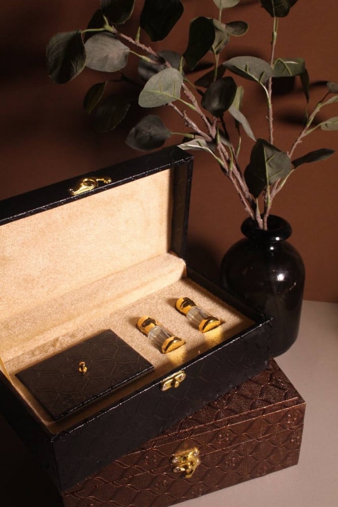 يحتوي على عبوتين ربع توله ومكان مخصص للعود يتسع لأوقية من العود تقريبا