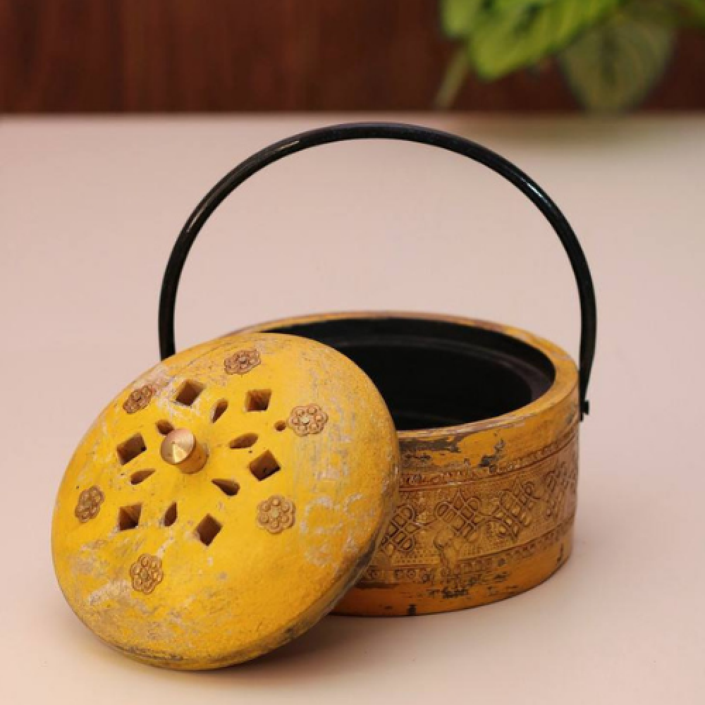 مبخر من الخشب الطبيعي مصبوغ باللون الاصفر مع النحاس المزخرف